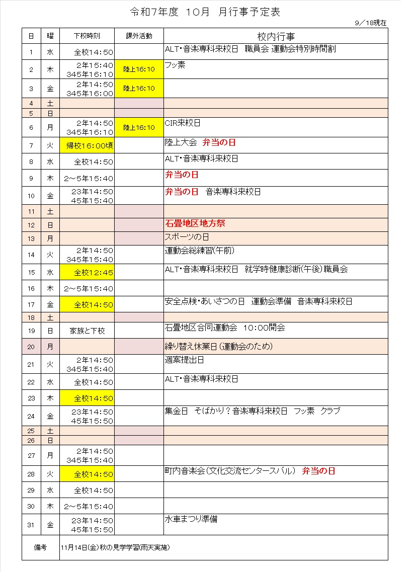 10月.jpg 下校時刻が通常と変更になっている日があります。